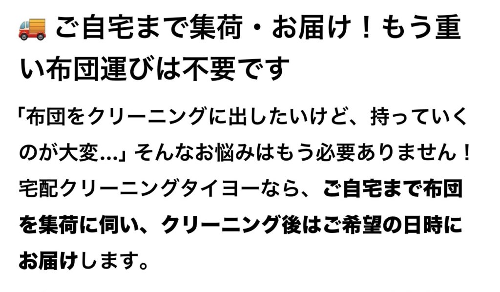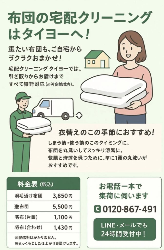 ふかふか清潔な布団で快眠を 宅配クリーニングタイヨーにお任せ 集配エリア  大阪市(一部のエリアを除く) 茨木市 吹田市 箕面市 豊中市 摂津市 守口市 門真市 旭区 鶴見区 城東区 東淀川区